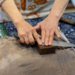 講師の指導にそって、砥石で刃物を研ぐ体験ワークショップ。