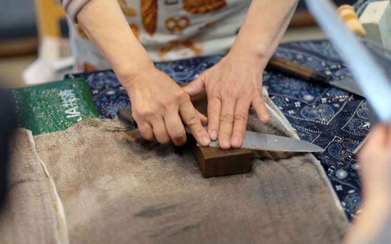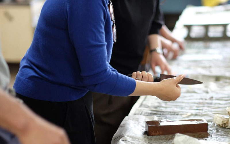 講師の指導にそって、砥石で刃物を研ぐ体験ワークショップ。